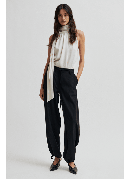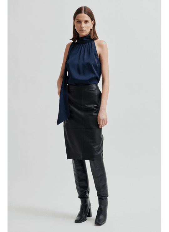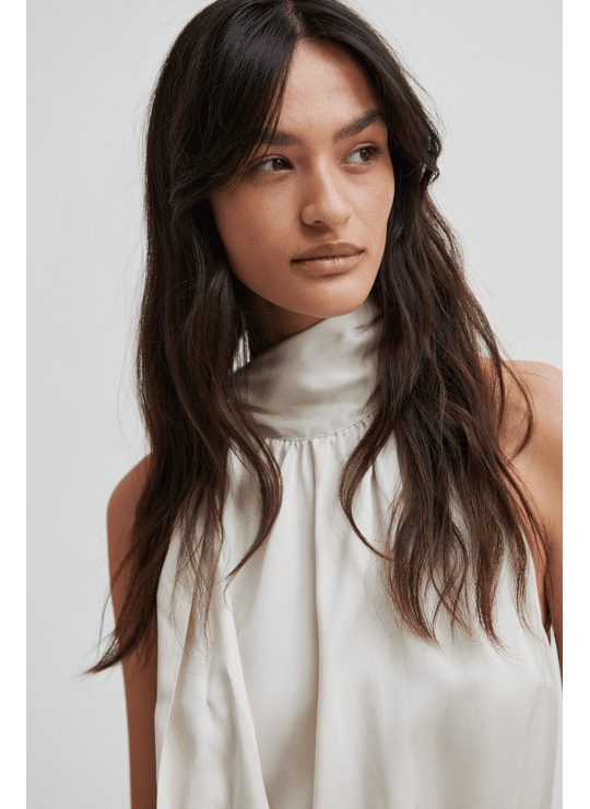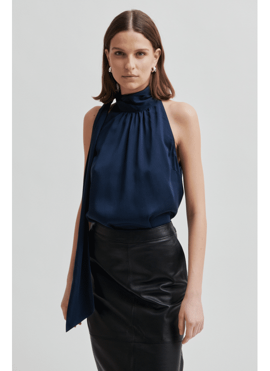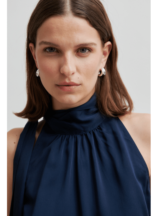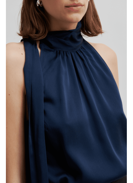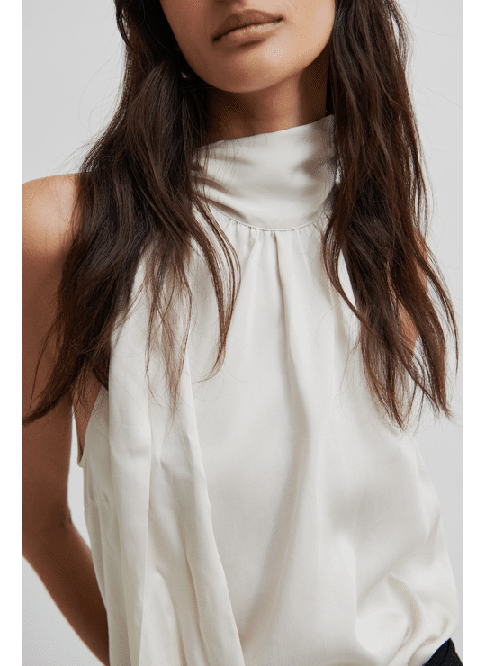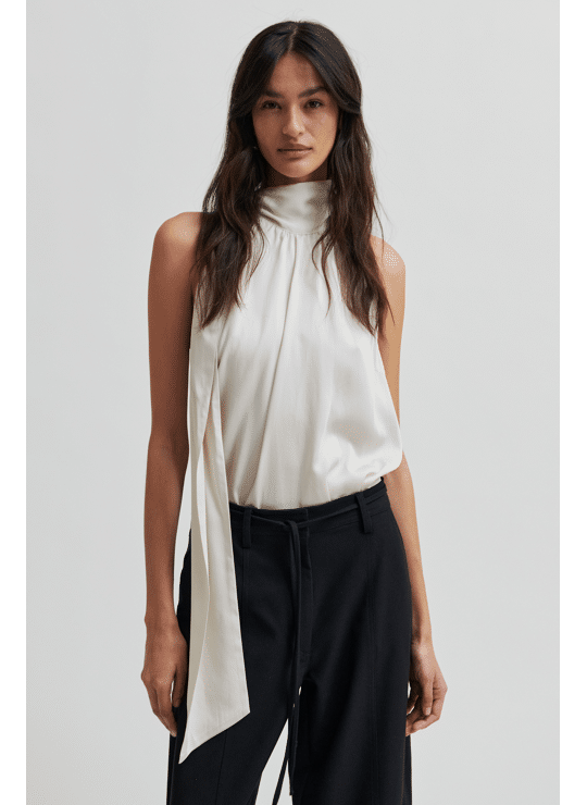 Second Female sleeveless high-neck blouse. The blouse is made in a silky-soft viscose-tencel blend. Featuring a high neck with tie fastening at one side. Regular fit.