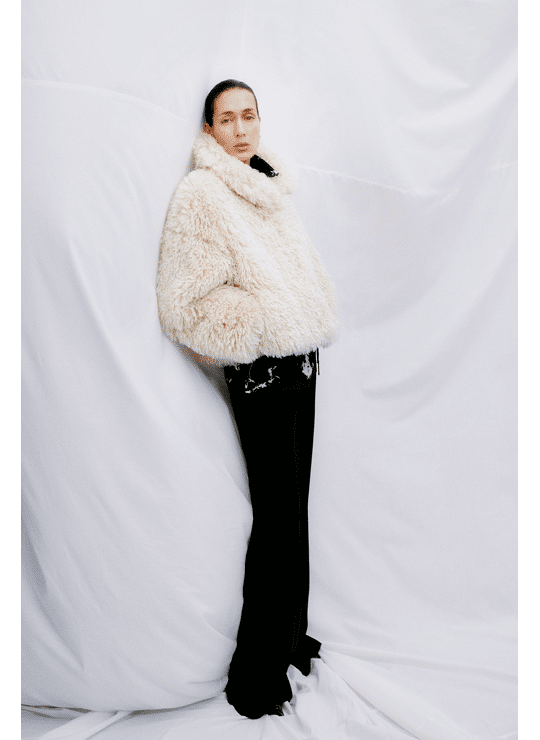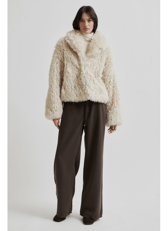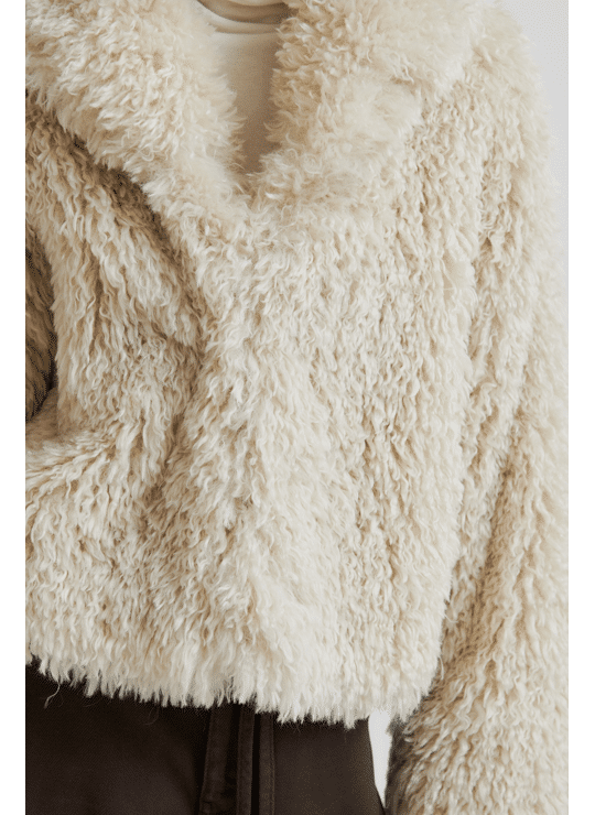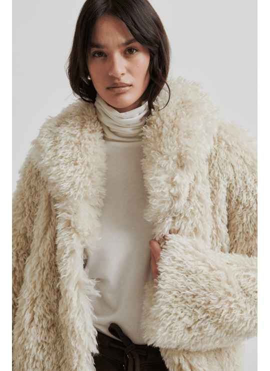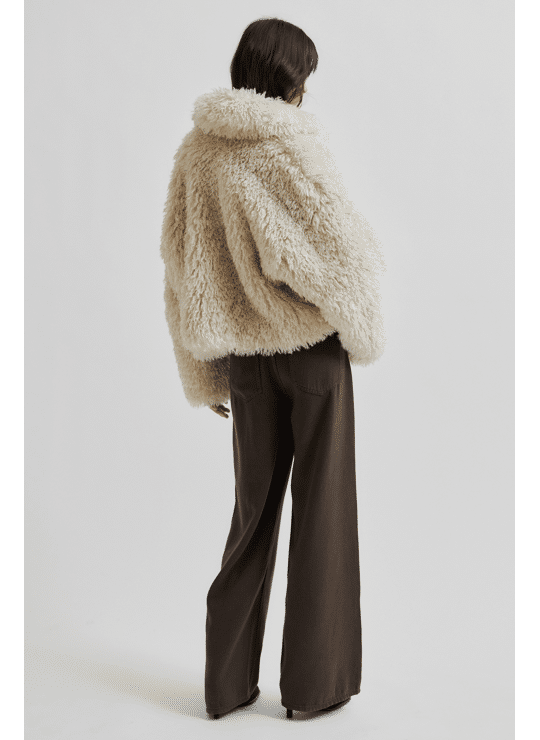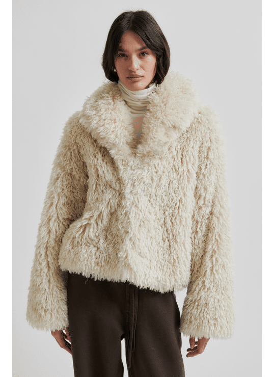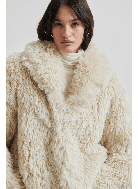 Second Female shaggy jacket. The jacket is made in an ultra-soft fabric with shaggy, sheep-like texture. Featuring a concealed hook and eye fastening at the front and two concealed pockets. Fully lined. Regular fit with relaxed, slightly boxy silhouette.