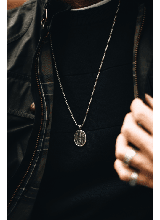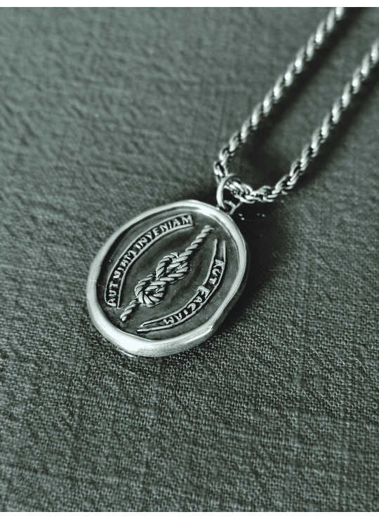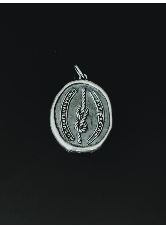 Een moderne en toch rustieke hanger met vakkundig vervaardigde details. Op de zwaar geoxideerde voorkant vind je de Latijnse inscriptie: 'Aut viam inveniam, aut faciam', ofwel 'Ik zal ofwel een weg vinden, of er een creëren'. Het gekantelde en geknoopte oneindigheidssymbool staat voor de vastberadenheid om daar nooit mee te stoppen.