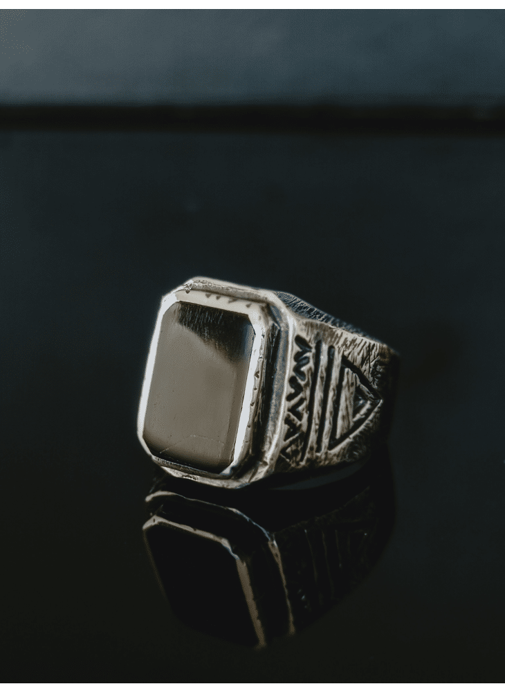 Deze iconische statementring draagt een rechthoekige zwarte onyx. Onyx staat voor bescherming en emotionele en fysieke kracht en is mooi te combineren met andere sieraden. Een gekrast oppervlak en geoxideerde details geven de Tian-ring een vintage en rustieke uitstraling.